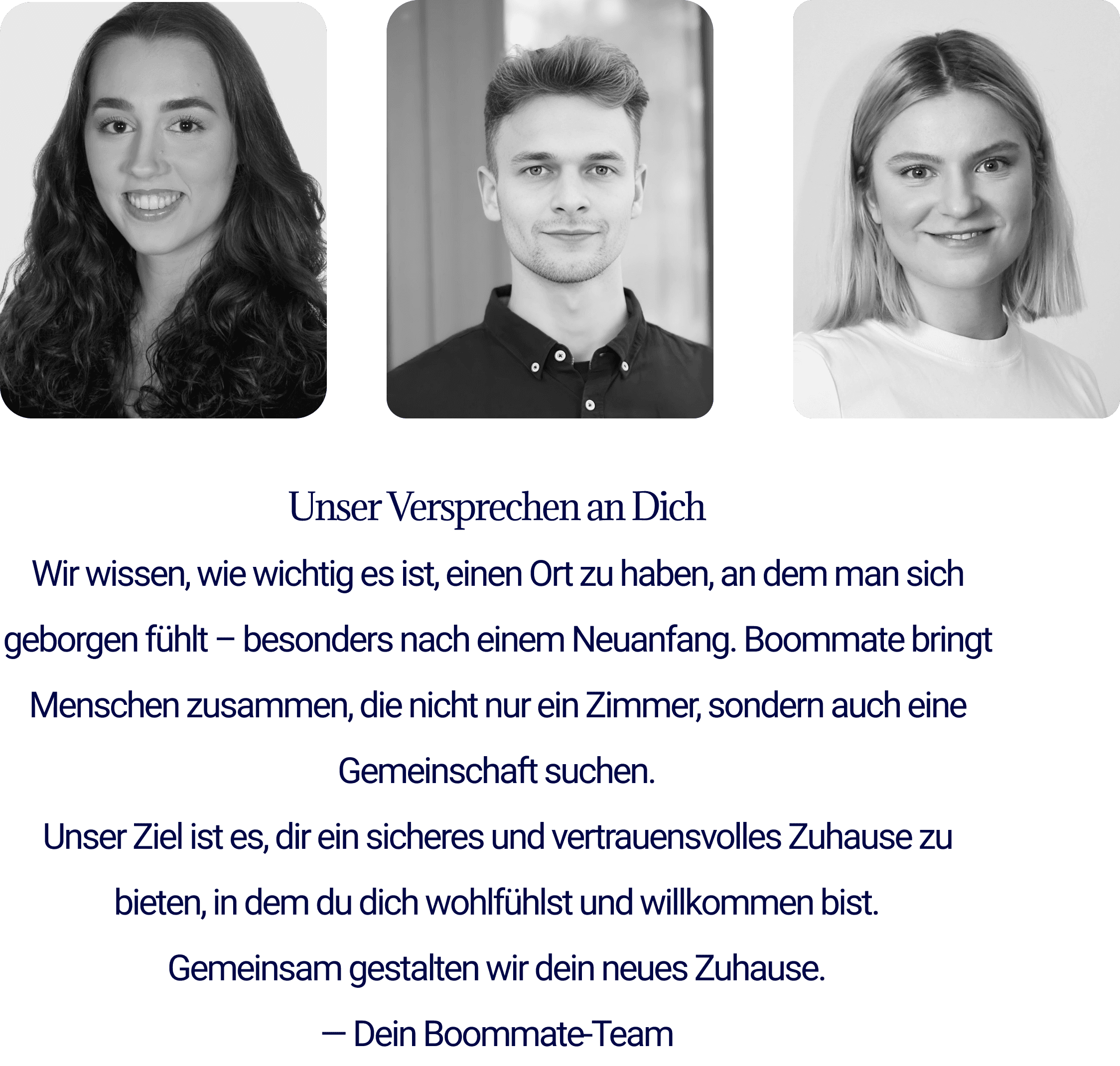 Boommate ist ein junges Start-up, das aus einer persönlichen, familiären Erfahrung heraus entstanden ist: Wir haben selbst erlebt, wie wichtig ein unterstützendes Wohnumfeld für Menschen ab 40+ sein kann. Durch zahlreiche Gespräche mit unserer Zielgruppe und intensiver Recherche haben wir erkannt, wie groß der Bedarf an gemeinschaftlichen und bezahlbaren Wohnmöglichkeiten ist.
